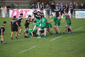 MOUGUERRE : 35 5 essais de Nicolas Schuller, Théo Hiallé (2) et Pierre Laxague (2), 2 transformations et 2 pénalités de Baptiste Aguerre BOUCAU
