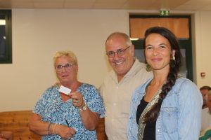 Ensuite, Amélie, participante à l’Assemblée Générale, fut sollicitée pour le tirage au sort du JAMBON. Elle plongea la main dans le sac et en retira un bulletin parmi les 150. Qui croyez-vous être le gagnant ? C’est notre fidèle et disponible secrétaire, Marie-Jo Bonetbelts. Les discussions se poursuivirent autour d’un amical apéro offert par la municipalité.