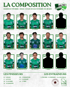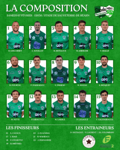 Belle maîtrise affichée tout au long de la rencontre par notre équipe qui avait fière allure, comportement d’un groupe plus que jamais leader de sa poule avec 62 points, 10 d’avance sur Oursbelille qui compte 1 match en moins. Dimanche avec la réception du second de poule, les Verts auront l’occasion de marquer sacrément leur territoire.